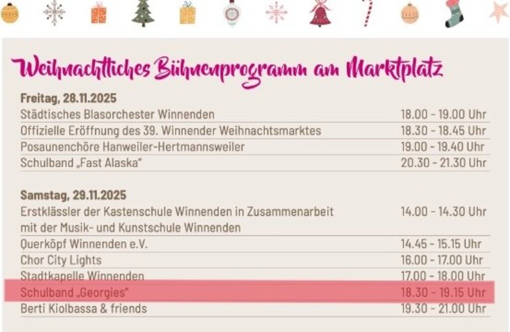 Herzliche Einladung zum Auftritt der Schulband „The Georgies“ am Samstag auf dem Weihnachtsmarkt! Wir präsentieren neue und bekannte Stück und unsere Arbeit von der Probenphase auf „Schloss Kapfenburg“.