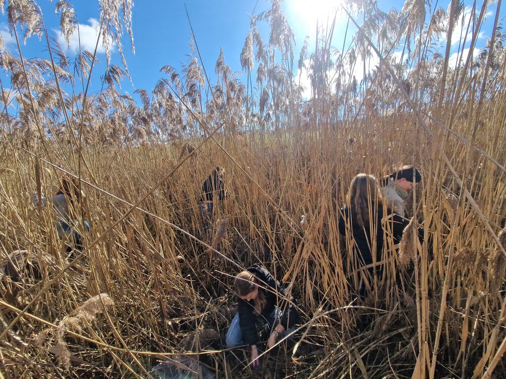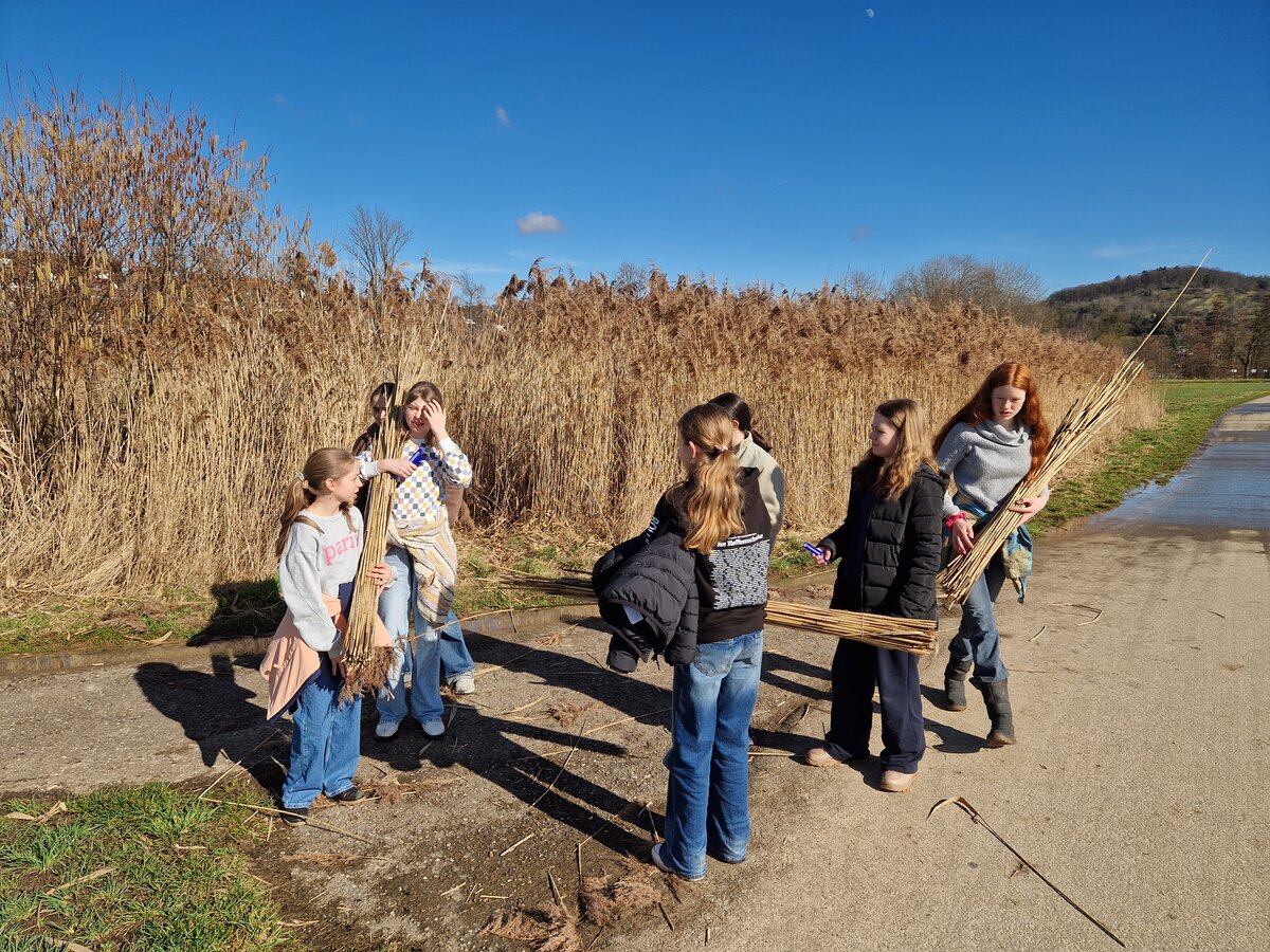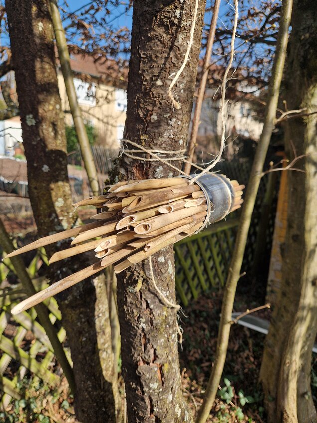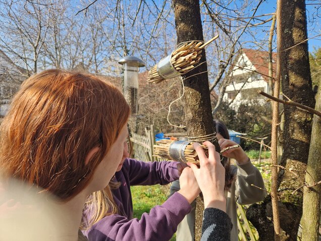 Dazu haben wir das abgeschnittene Schilfrohr in die Konservendose gefüllt, bis die komplette Dose voll war und nichts mehr herausfiel. Im Anschluss haben wir die Dosen im Schulgarten aufgehängt und freuen uns schon, wenn bald die ersten Bienen einziehen.